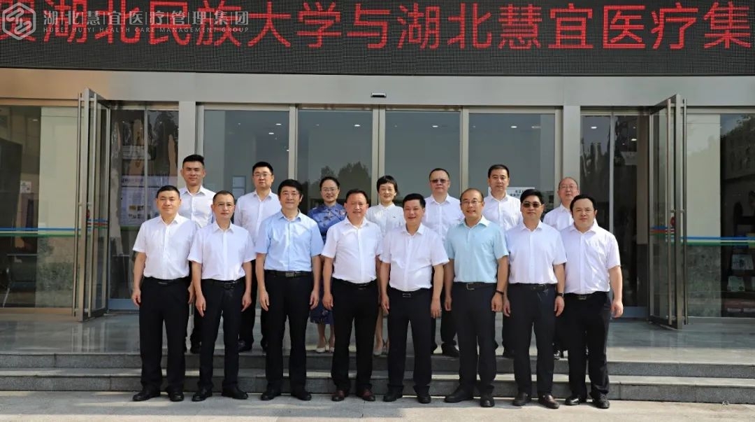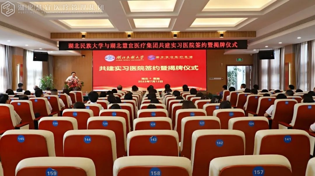 2023年7月12日,湖北民族大学与湖北慧宜医疗集团共建实习医院签约暨揭牌仪式在湖北慧宜医疗集团举行。湖北民族大学医学部常务副主任罗洪斌、党委副书记许宗友、副主任熊茂来、医教协同办公室主任徐俊芳,湖北慧宜医疗集团董事长杨方列、总顾问向阳、副院长刘道远,恩施慧宜中西医结合风湿医院执行院长向诗非、副院长张宏伟、朱祖欣、许斌、周文来、吴长坤,恩施慧宜眼科医院执行院长包煜芝,业务院长肖紫云、芦晓磊,恩施慧宜中西医结合风湿医院科教科主任罗嘉等领导及湖北慧宜医疗集团职工代表近200人出席签约揭牌仪式。仪式由恩施慧宜中西医结合风湿医院执行院长向诗非主持。